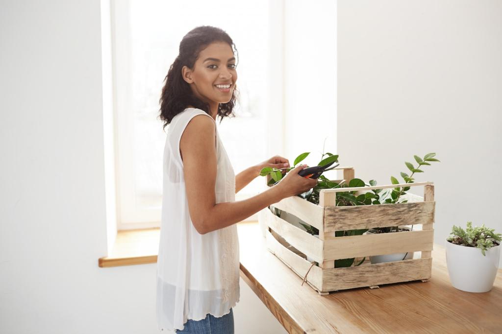 Im Winter trocknet Heizungsluft, im Sommer steigt die Feuchte. Hygrometer helfen, Schwankungen rechtzeitig zu sehen. Zimmerpflanzen und Schalen mit Wasser wirken als sanfte Puffer. Platzieren Sie Möbel mit Abstand zur Heizung und Außenwand. Welche Maßnahmen funktionieren in Ihrer Region am besten?